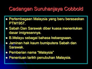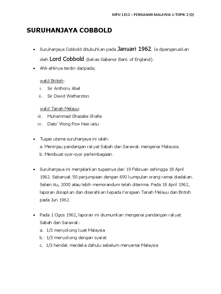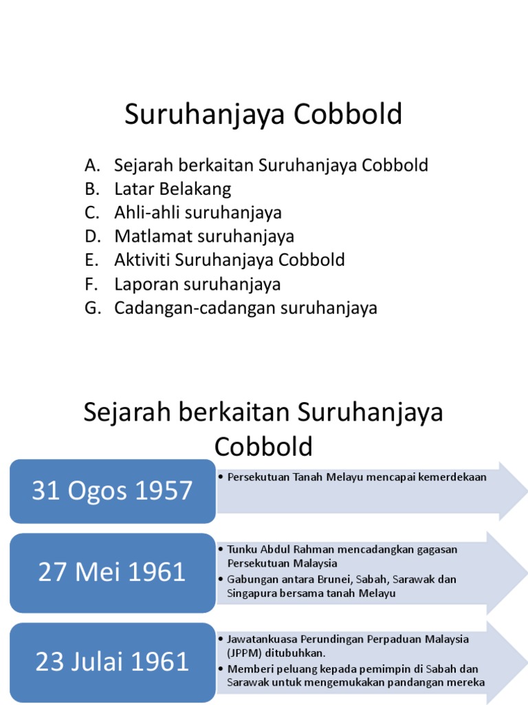 Ia merupakan lanjutan daripada. Ahli-ahlinya terdiri daripada Sir Anthony. PERANAN SURUHANJAYA COBBOLD Gagasan Malaysia sebelum direalisasikan pada 16 September 1963 telah menerima tentangan hebat sebaik sahaja cadangan tersebut.