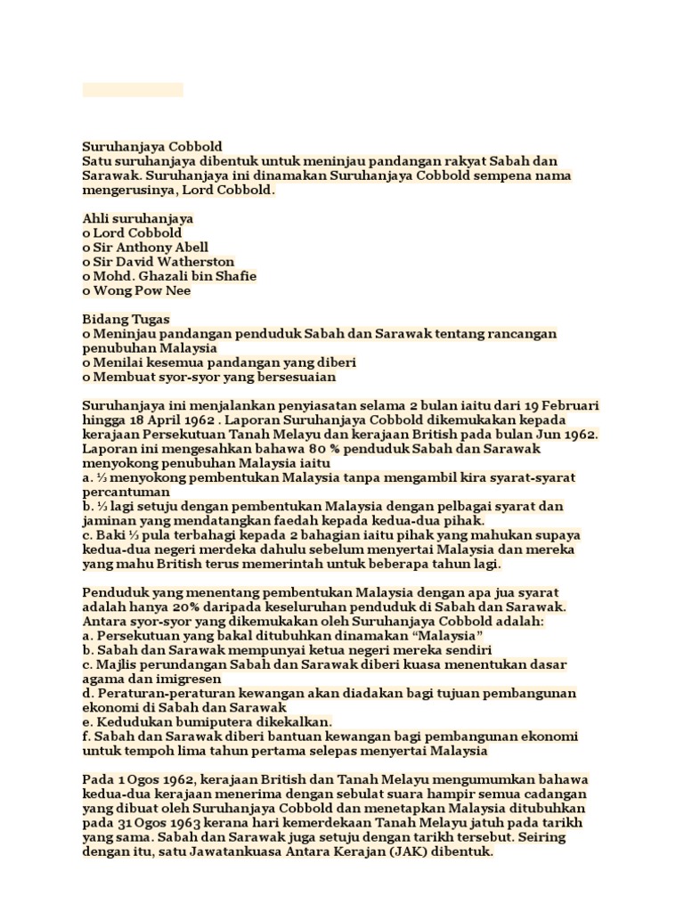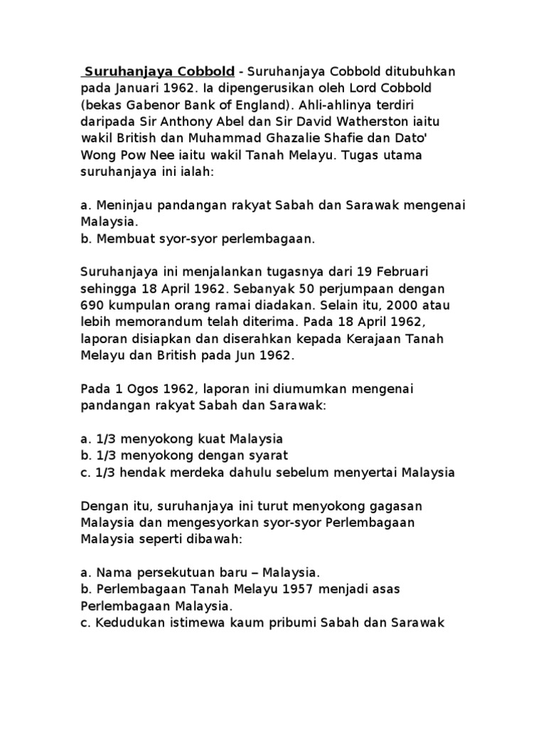 Suruhanjaya ini ditubuhkan untuk meninjau pendapat rakyat Sarawak dan Sabah tentang gagasan Malaysia. Up to 24 cash back Suruhanjaya Cobbold Suruhanjaya Cobbold ditubuhkan pada Januari 1962.